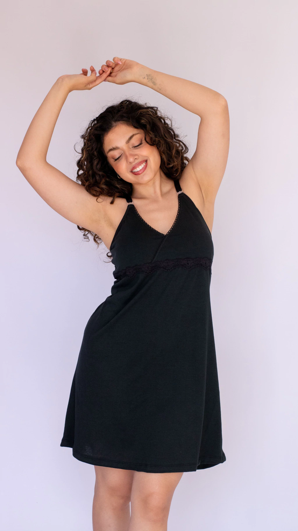 Camisón maternal de algodón con puntilla para amamantar. Tiene sus avíos de plástico para que no te cause ninguna reacción alérgica. La espalda es completa, los breteles regulables y tiene un detalle de puntilla en el bajo busto.