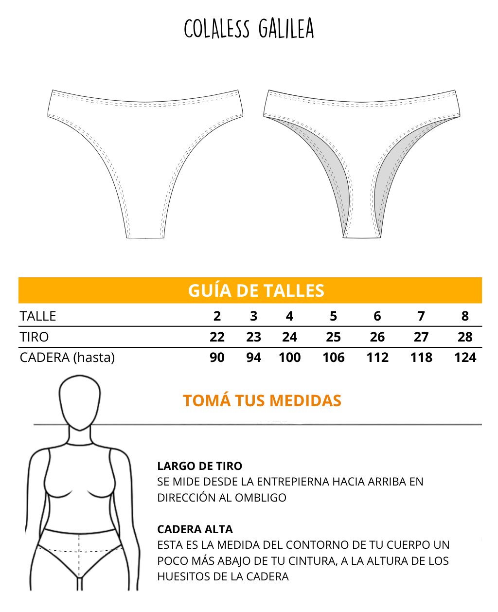 La colaless Galilea es básica, sexy y esencial. De tiro medio y completamente forrada, tiene elástico embutido en cintura y piernas para un calce súper cómodo. Sus tiras finitas son geniales para un bronceado uniforme y realza la cola. Un modelo clásico, atemporal y muy fácil de combinar con todos tus corpiños.
