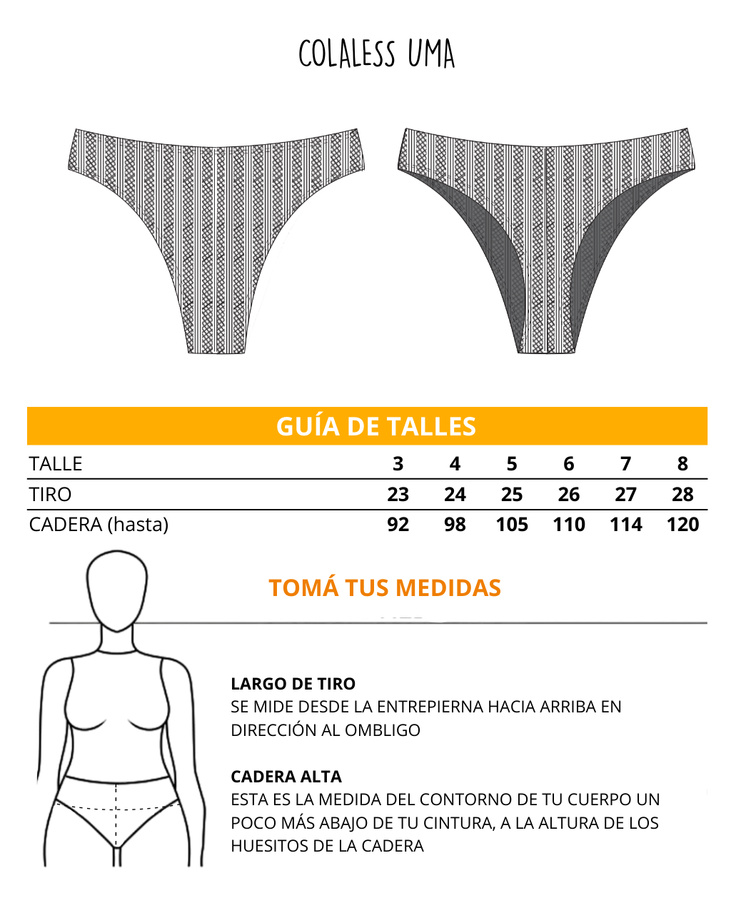 La colaless Uma tiene el mismo calce que nuestra colaless Galilea, pero está confeccionada en esta tela de punto calada SOÑADA. Es de tiro medio y totalmente forrada para que no transparente nada. Por esto mismo, elastiza un poco menos que la tela de tricot. Sus tiras finitas son geniales para un bronceado uniforme y realza la cola. Un modelo clásico y atemporal