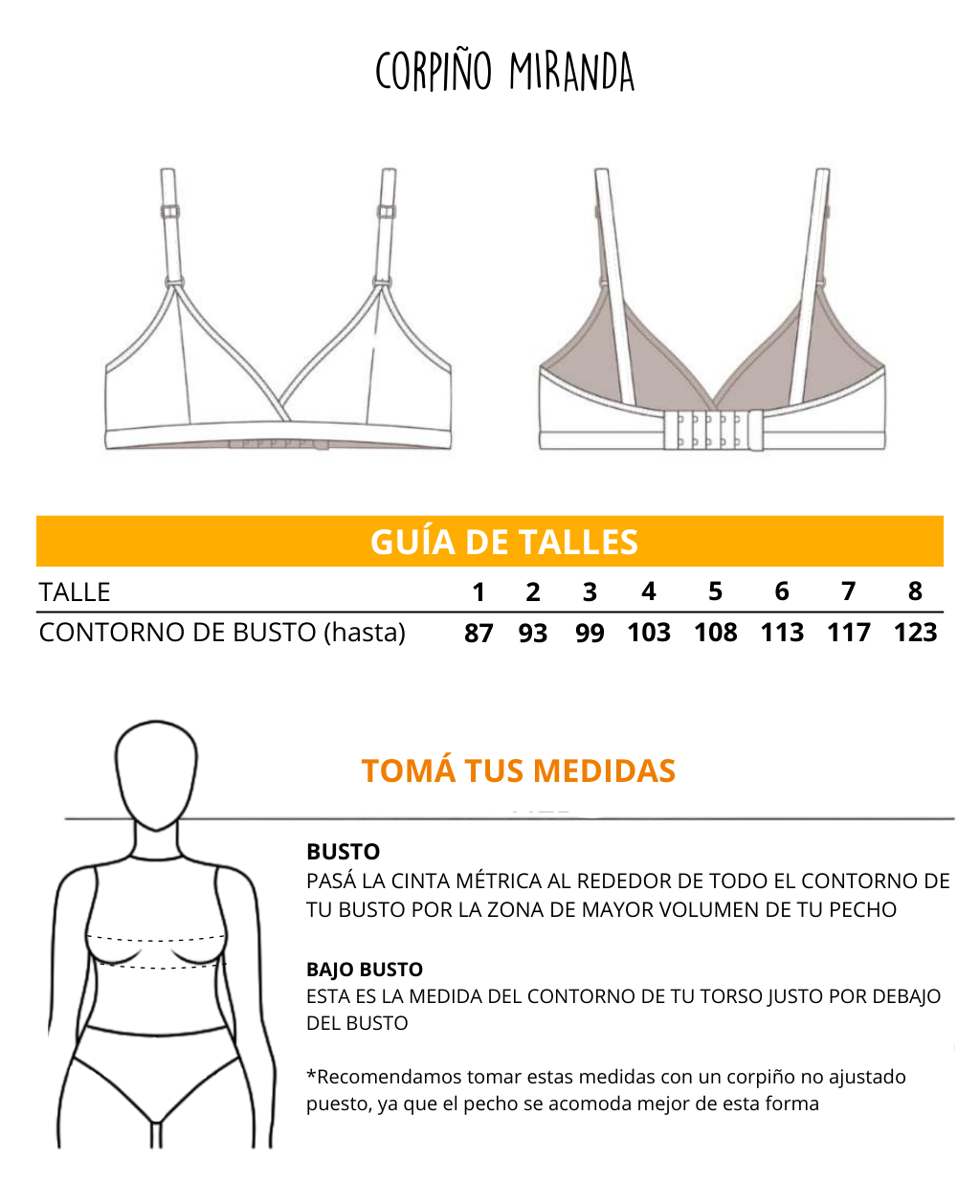 | Nombre | Busto | Bajo busto | Talle |