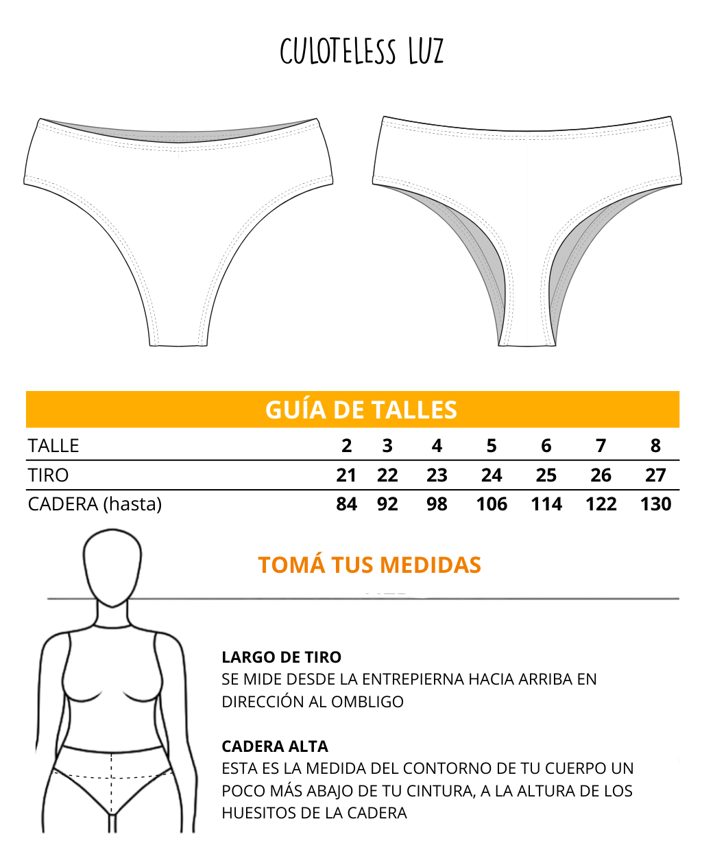 Nombre | Cintura | Cadera alta | Cadera baja | Talle |