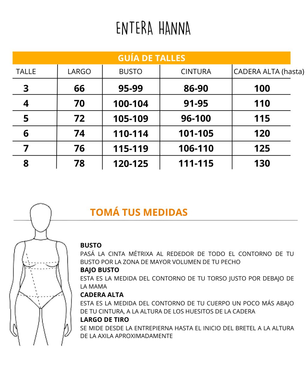 | Nombre | Busto | Bajo busto | Cintura | Cadera alta | Talle |