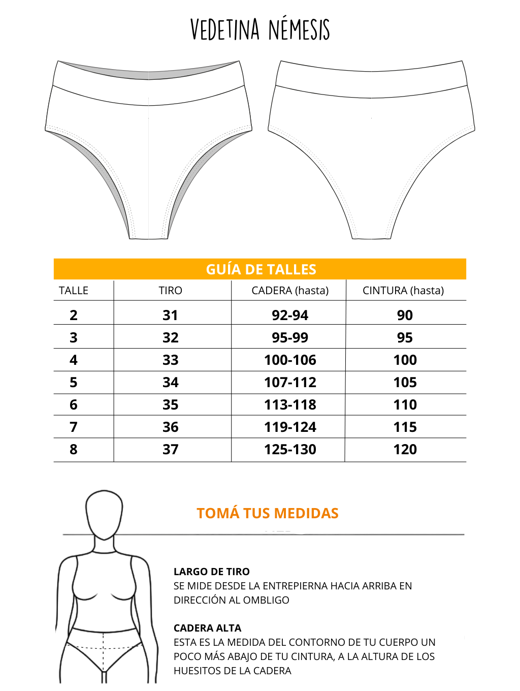 | Nombre | Busto | Bajo busto | Cintura | Cadera alta | Talle |