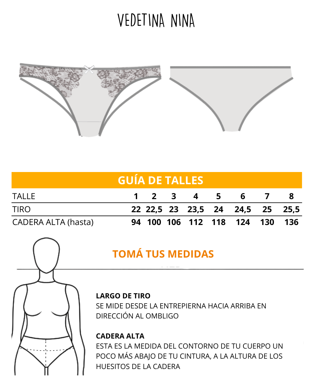 Nina es una bombacha con una moldería clásica (similar a la AURA), con un calce cómodo y favorecedor, pero con detalles que la hacen especial