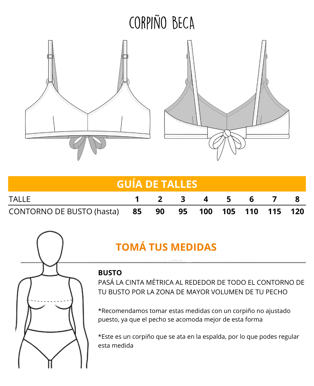 El corpiño Beca tiene un escote abierto con recortes que lo hacen distinto y súper canchero. Los breteles son anchos y regulables, la espalda se ata para que lo ajustes como quieras y el elástico en el bajo busto hace que se quede en su lugar todo el día. Está pensado para que te sientas cómoda, contenida y segura, abrazada